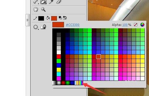 2、在工具栏的下方点击颜色桶图标右侧的颜色处,弹出颜色选择,点击最底下的彩色渐变色。对着形状中想要填充的位置点击。