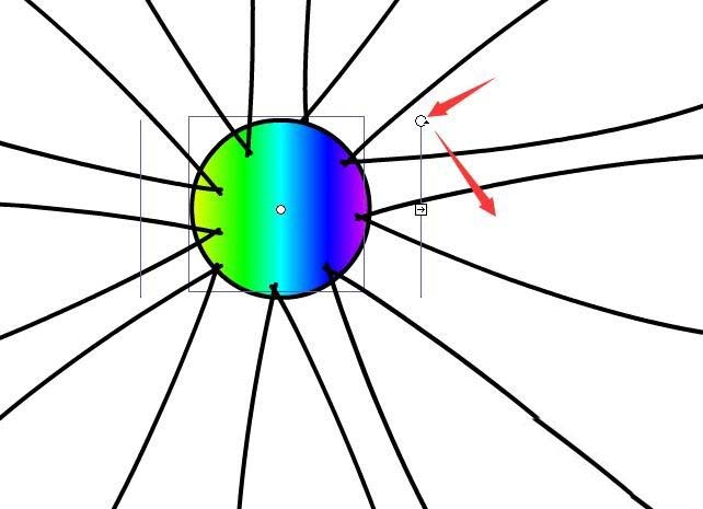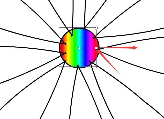 4、然后对着填充好色彩的位置点击,出现一个方框形状,对着方框右侧一个带箭头的小白块处按住往右侧拉动,如图箭头所示。我们发现,渐变色就会向左右两边扩展。