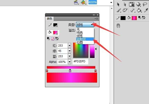 8、点击类型后面的列表框,可以选择颜色类型,刚才上面的是线性渐变,现在点击放射状,则形状中的颜色就变成圆形放射状效果。