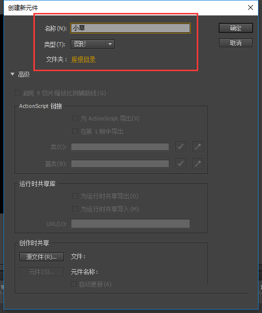 3、在插入菜单中找到新建元件命令,新建一个命令为“小草”的图形元件。单击确定进行创建。