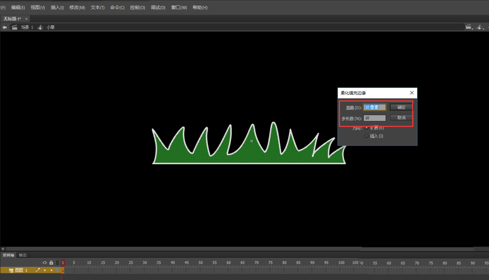 7、使用颜料桶为小草填充一个绿色的颜色填充,并在修改菜单的图形中找到柔化边缘命令,执行柔化边缘操作得到一个小草的图形元件。