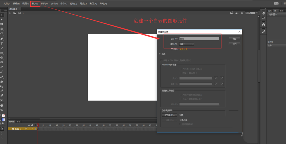1、在flash文档中,选择插入中的新建元件命令,在弹出的创建新元件对话框中输入元件名称“白云”,选择类型为图形元件,点击创建。
