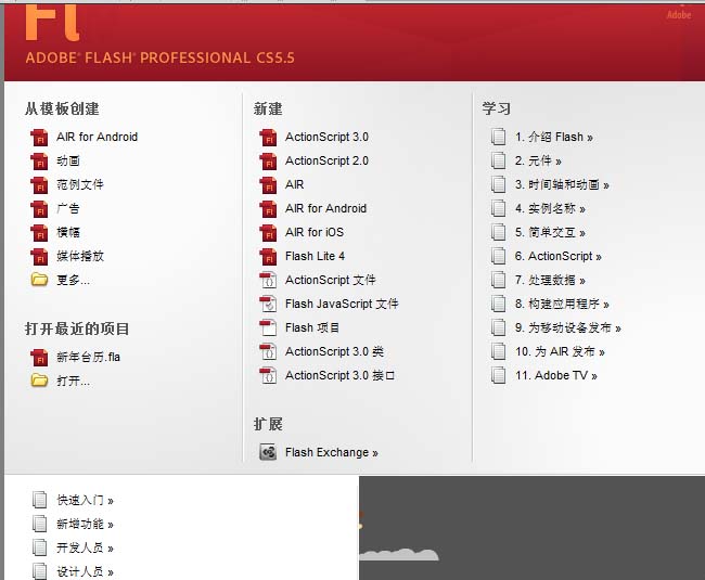 6、当首选参数窗口关闭之后我们就看到开始页就出现了。包括我们之后再次启动flash软件都能够再次看到开始页。