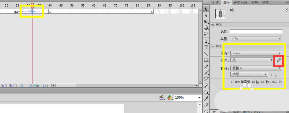 3、这时,我们选中时间轴上的声音,在属性面板上设置。