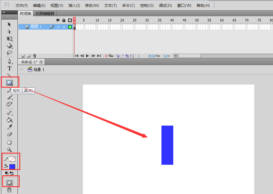 2、选择工具栏中的矩形工具,勾选工具栏下方的对象绘制按钮,然后设置笔触颜色为无,填充颜色可以随意选择一个你喜欢的颜色,然后在场景画布的中间区域绘制一个大小合适的矩形出来。