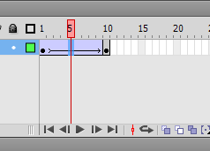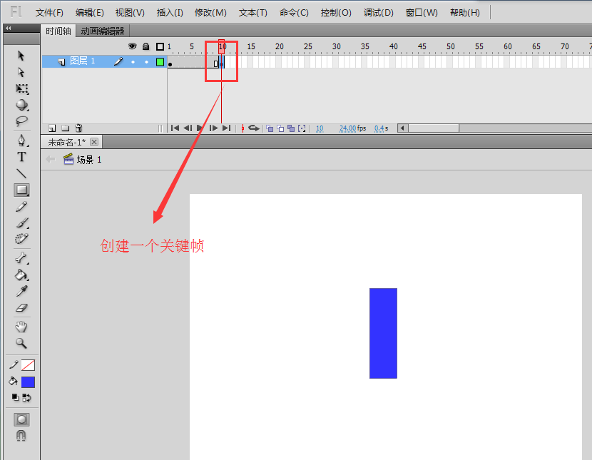 3、选中时间轴窗口,在第一帧和第十帧的位置,按键盘上的快捷键F6创建一个关键帧(也可以通过插入——时间轴——关键帧来创建关键帧)
