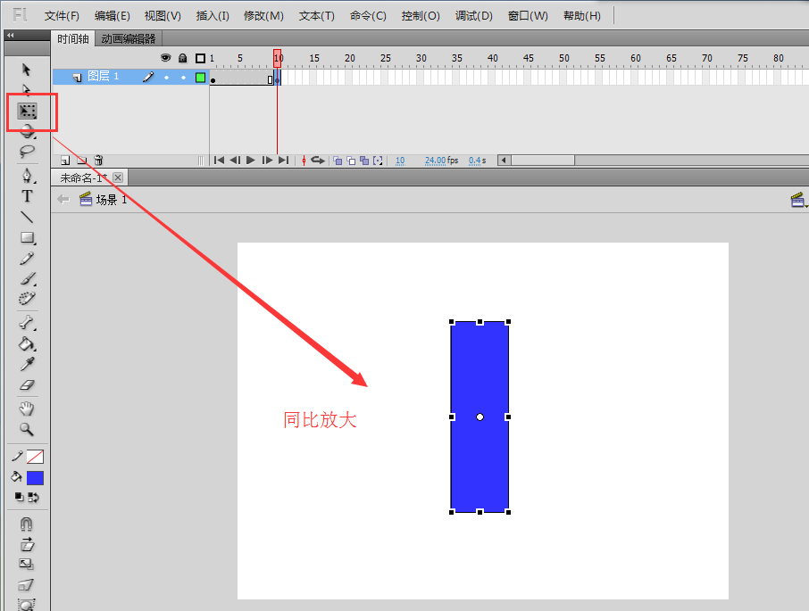 4、鼠标选中第十关键帧,选择工具栏中的任意变形工具,按住键盘上的shift+alt键同比放大绘制的矩形对象。大小感觉合适即可。