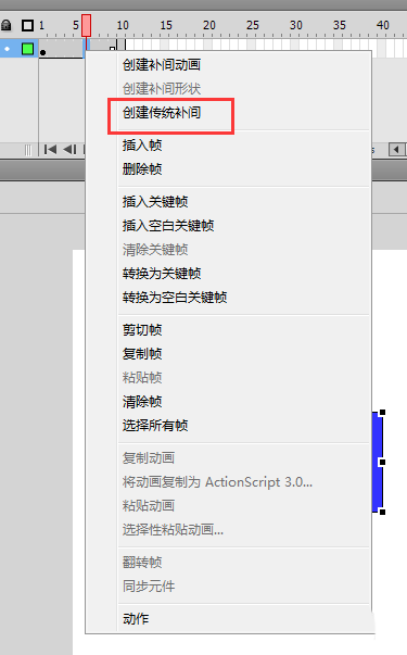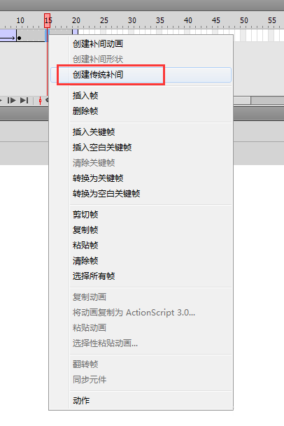 5、将鼠标定位到第一帧与第十帧之间的任意一帧,然后右键鼠标,选择创建传统补间动画。