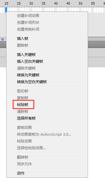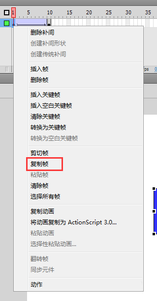 6、鼠标选中第一帧,右键选择复制帧,然后再将鼠标定位到第二十帧位置,右键选择粘贴帧。