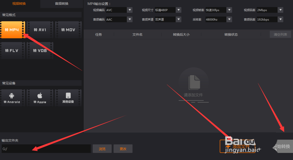 3、左边点击MP4 在右边把刚才的视频添加进去,然后点击进行转换。这样我们就把之前的FLASH 动画转换成了MP4格式的视频了。