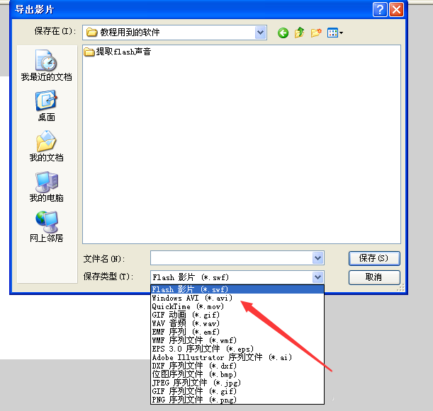 7、然后我们将影片导出AVI格式。注意 FLASH默认的格式是SWF。但是这里我们没有用这种格式的。因为这种格式很特殊需要用到特殊的视频浏览器才能打开。如果电脑没有装的话 还需要去安装一个。
