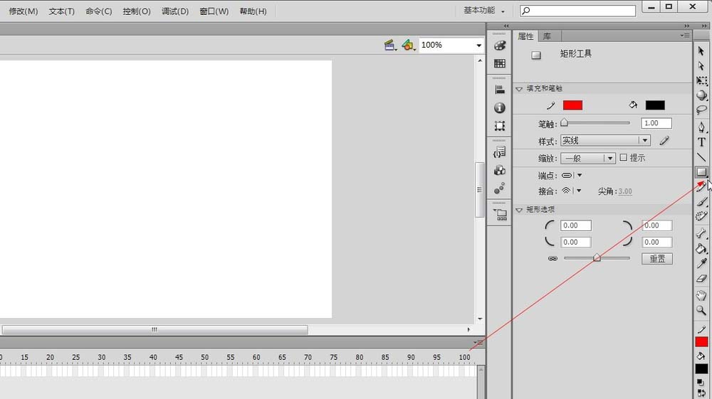 1、如图所示,我们打开一个flash文件,之后点击箭头所指的矩形工具的黑色三角形,在弹出的菜单中,我们选择哪个椭圆工具,来绘制一个椭圆。
