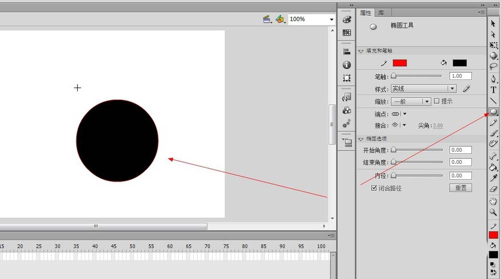 2、如图所示,我们切换到椭圆工具之后,将鼠标移动到舞台上,用十字状的椭圆绘制工具,绘制一个椭圆。