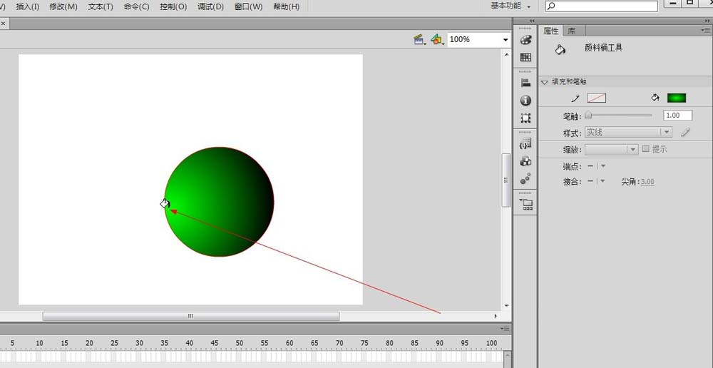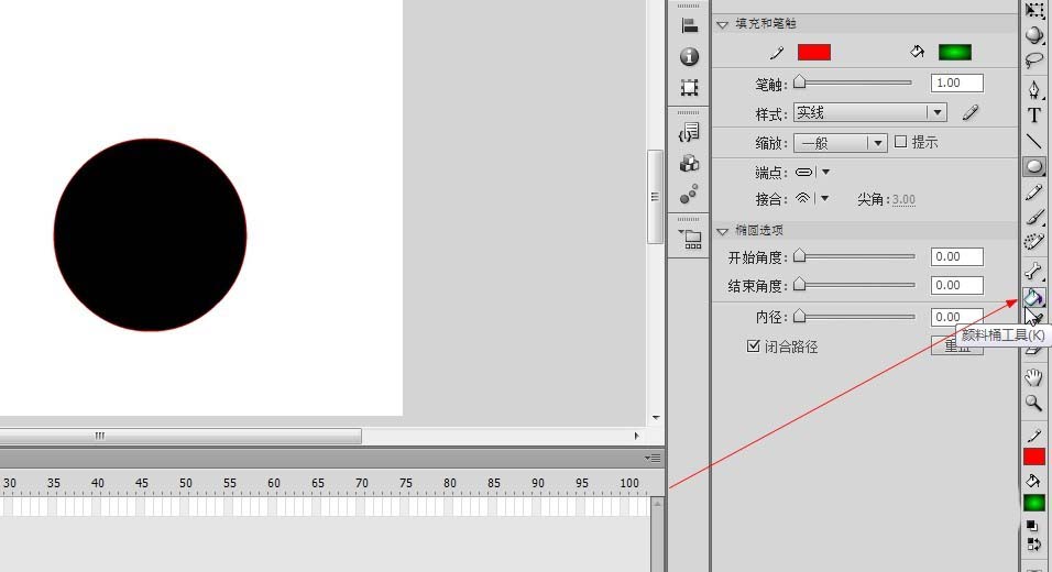 3、如图所示,我们点击箭头所指的颜料桶工具,来改变这个椭圆的填充色。