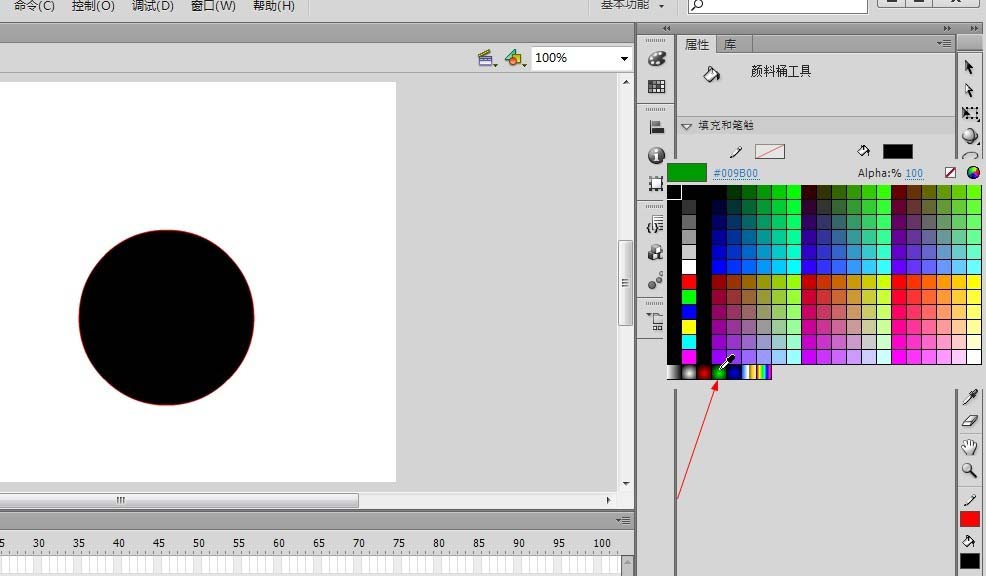 4、如图所示,在颜料桶工具属性那里,我们单击箭头所指的颜料桶那里,来选择一个填充色。