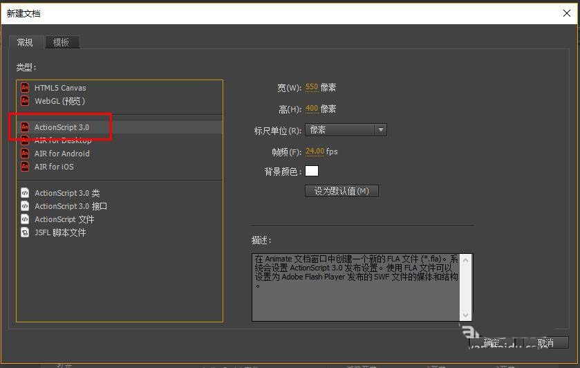 1、这里用的是AnimateCC,打开软件,新建AS3文档。