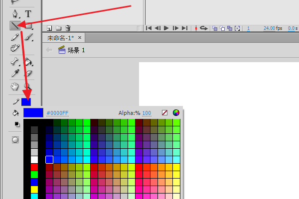 1、如图所示,打开Flash CS6之后,点击线条工具,然后选择笔触颜色。