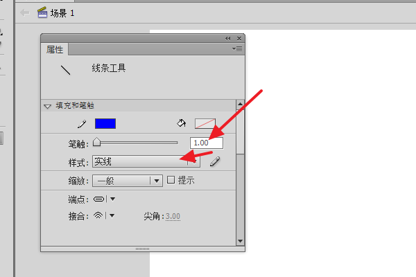 2、然后在线条工具的属性面板中,我们可以通过笔触调整线条的粗细,通过样式选择线条的类型,比如实线、虚线。