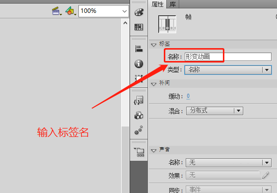 5、在标签选项中输入我们第一个关键帧的标签名称,这里我输入的是“形变动画”。