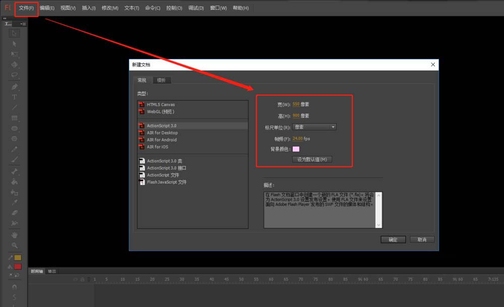 1、启动flash cc软件,选择文件中的新建命令,设置flash文档舞台的大小等,来创建一个flash项目。