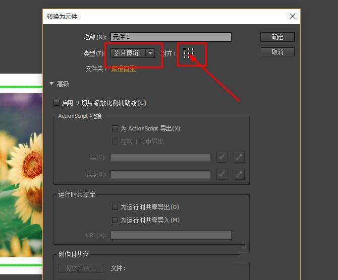 4、选择圆转换为影片剪辑,注意注册点在中心,且要设置链接名为CELL