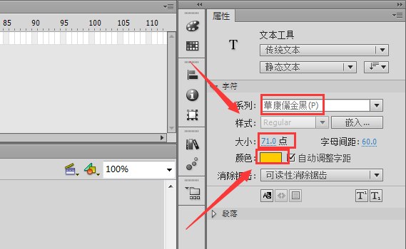4、选择文字选项在右侧属性面板里设置文字的字体,大小和颜色如图所示: