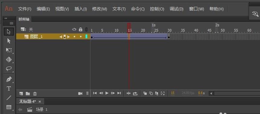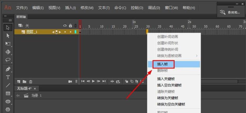 5、延长时间轴到30帧,在30帧处右键选择插入帧或使用快捷键f5