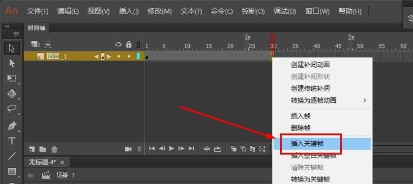 6、在第30帧右键选择插入关键帧,右键选择插入关键帧或使用快捷方式f6