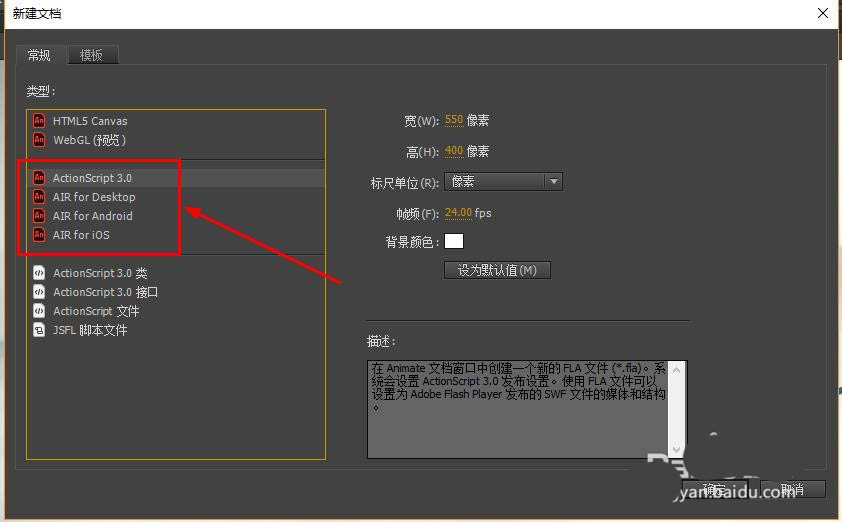 1、这里用的是Animate CC软件,打开软件,新建AS3文档