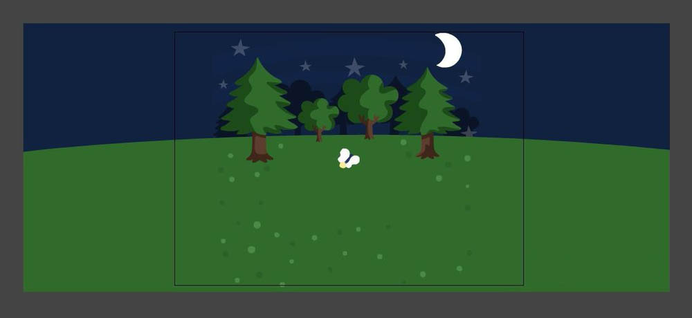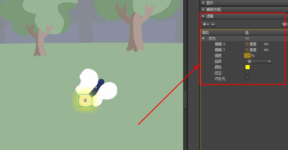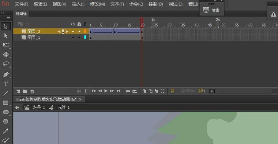 2、将素材放到舞台上,包括草丛和萤火虫。如图所示: