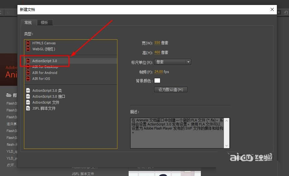 1、打开软件,新建AS3文档。这里用的是Animate CC.