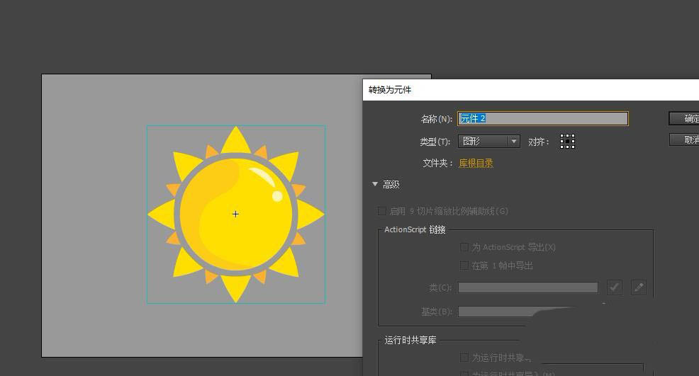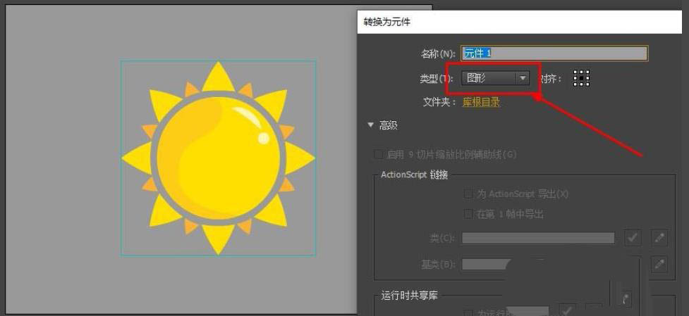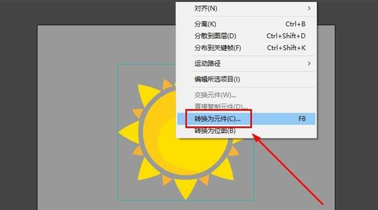 3、不同形态的太阳,需要不同的处理方式,这里就简单讲一下现有形状的太阳制作方法。将素材转换为元件,选择图形元件。