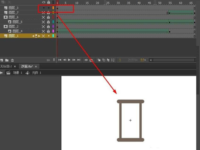 3、转换为图形元件,双击进入编辑状态。如图所示,将沙漏先拆成两个部分,外框和玻璃,分别放到最上层和最下层。