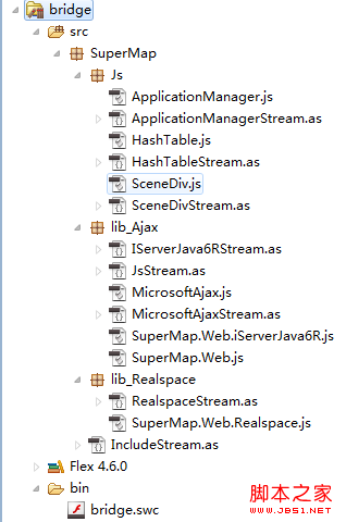 我建的项目叫bridge,里面有我所有的js文件,还有不少as文件,细心的发现每一个js文件旁边都有一个...Stream.as文件,这里就是重点了,我们如何才能把js文件打包到swc里面呢,flex提供了一种流的方式,例如上面的ApplicationManager.js文件,我们创建一个类ApplicationManagerStream继承于flash.utils.ByteArray,代码如下: