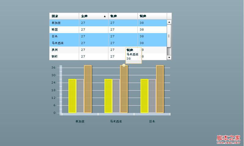 <!--Column chart设置成能解析Country: "Russia", Gold: 27, Silver:27, Bronze: 38这样的数据项-->