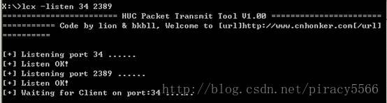 Dos下的软件大家应该会用吧,x:lcx –listen 34 2389,说明一下这句指令的意思,这句话的意思就是监听本机的34端口然后将数据转发到2389端口,当然这里的34 2389端口是看我心情而定,但是呢,必须要注意这些端口也不能使用那些本机已经开放的端口,那些端口已经被占用不能再用,例如我的1025在我转发之前查询时已经开放了,就不要再利用1025进行转发了,再说了,那么多端口何必死缠着那一个已经被使用的端口呢?废话多了点,见谅,理是越辩越明了嘛!