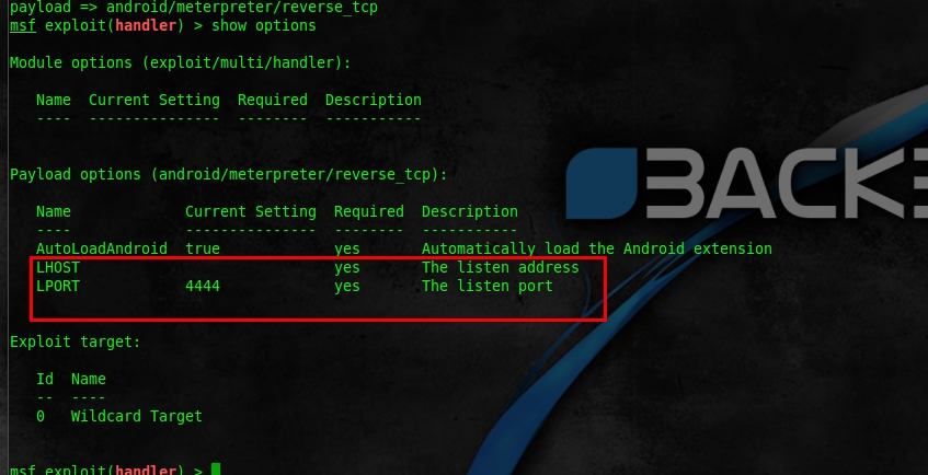 我们看见payload里边有两个参数要设置 LHOST和LPORT 表示地址和端口 默认的端口是4444 现在我们来更改设置