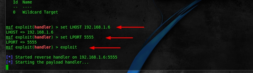1.set LHOST 192.168.1.6 这里的地址设置成我们刚才生成木马的IP地址