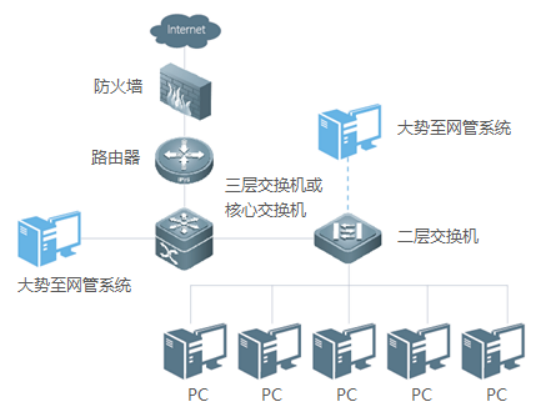 同时,针对三层交换机多网段网络环境,大势至公司还独创了“创新直连”部署方式(见下图),只需要接入三层交换机的一个网段就可以实现对所有网段的监控,实现最优监控多网段电脑上网行为。