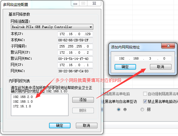 然后在配置网段时选择“配置多网段”,填写“默认网关IP”和“默认网关MAC”,即上图中的接口IP和MAC地址。如下图所示