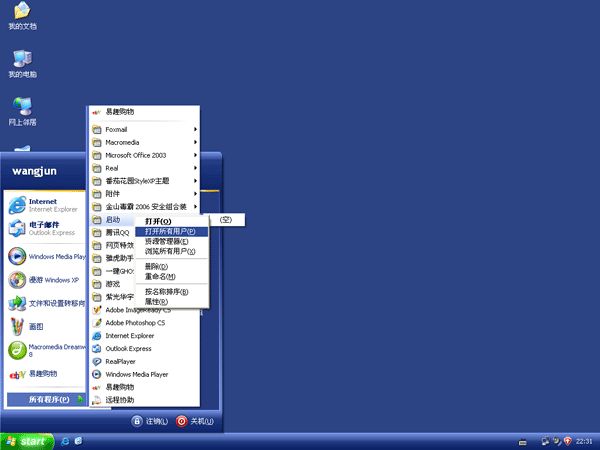 1. 打开电脑的启动项目录。具体操作是点击“开始”→“程序” →“启动”右键单击选择“打开所有用户”。如图: