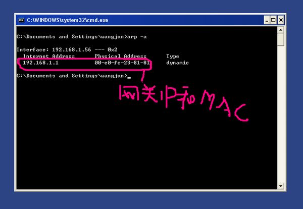 (注:以上的红色部分为本机的网关IP与MAC的对映关系,兰色部分本机IP与MAC的对映关系。具体的值各用户会有不同。请不要照以上完全抄写!如何查看本的IP与MAC以及网关的IP与MAC以下将做介绍。)
