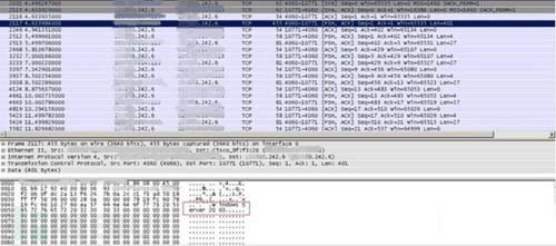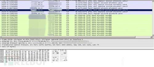 后续会进行一段时间的相互通信,通过数据分析发现,该通信包无明显特征,应该是为防止下断recv,增加分析recv包的难度。经过该段时间通信后,控制端会发送一个明显突变的包,然后受控机开始进行向外DDoS攻击。通过分析该包内容,该包明显相较于其他数据包不一样,对比随后就发生的DDoS攻击的目的IP地址,发现该包包含了DDoS攻击目标IP与端口号,因此可判断为该包为指令包,如图3所示。