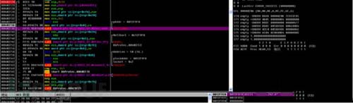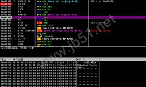 对send下断可以发现所发送的第一个数据包内容为,如图9所示,与图1中“报告包”数据内容对比可发现,该数据内容一致。
