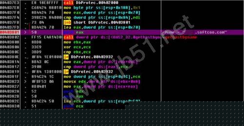 对gethostbyname下断可发现受控机会首先获取*.softcoo.com这个域名获取主机地址信息,如图7所示。