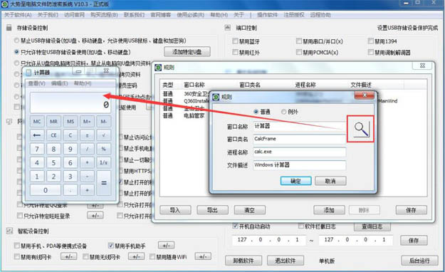 如果不确定关键词,可以通过“深度检测程序特征”功能来确定。打开要禁止的程序,拖动放大镜到程序窗口,自动读取程序特征,点击确定,然后保存即可。