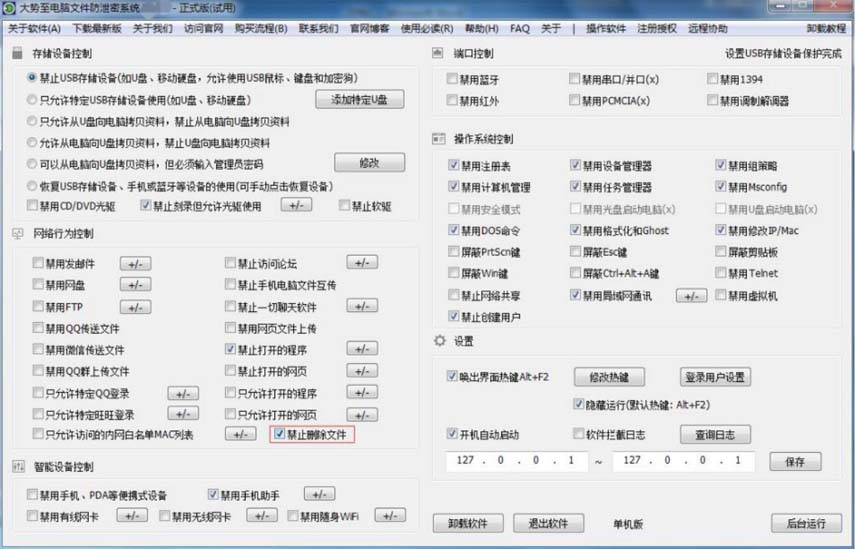 虽然在操作系统中设置文件夹的用户权限也可以达到禁止删除的目的,但是对于文件数量较多的情况时,操作过程过于繁琐,所以并不适用。相对而言,通过软件就要简单的多了,例如有一款软件叫做大势至电脑文件防泄密系统就有这个功能,下面就来向大家介绍一下具体设置方法。
