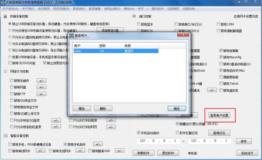 此时,我们可以看到软件上有一个选项是“禁止删除文件”,只需要勾选此选项就可以禁止删除电脑文件了,然后建议修改软件的默认密码,防止用户卸载软件,具体方法是:点击 “登录用户设置”,双击默认的用户名admin弹出修改框。