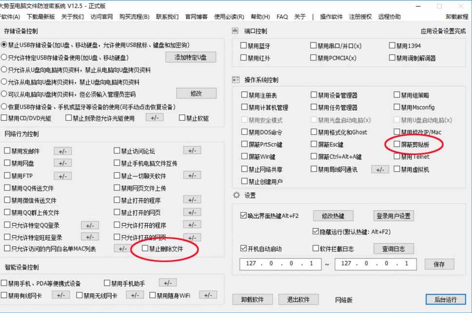 那么,如何实现禁止删除电脑文件、禁止剪切电脑文件、禁止粉碎电脑文件呢?可以安装大势至电脑文件防泄密系统,这是一款专门管理电脑文件外传,保护电脑数据安全的软件产品,安装仅需5秒钟,通过热键和密码打开软件界面,直接勾选“禁止删除文件”、“禁用剪切板”即可,如图: